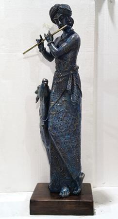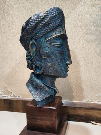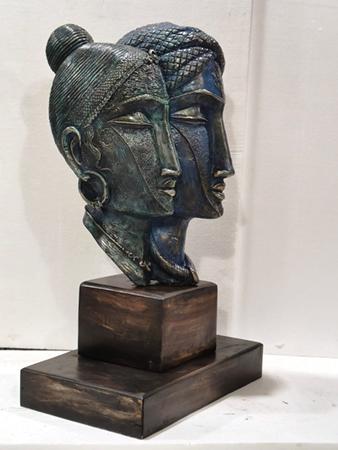 Karuna Shigvan’s sculptural language is lyrical, devotional, and inward-looking, shaped by an enduring engagement with feminine presence, musicality, and mythic memory. Her figures, often women, musicians, or dual-faced visages are not portraits in the literal sense but embodiments of states of being: listening, offering, waiting, remembering. Working with bronze and fibreglass, she builds surfaces through intricate texturing that recalls textiles, jewellery, and ritual ornamentation, allowing the skin of the sculpture to carry cultural memory and form.